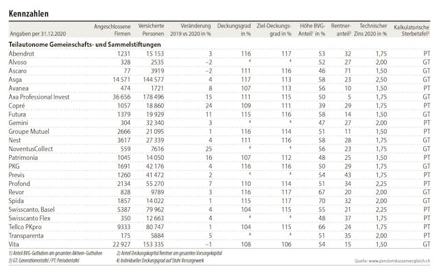 Der durchschnittliche Deckungsgrad der analysierten Vorsorgeeinrichtungen beträgt 111%, und alle Anbieter weisen grundsätzlich eine stabile finanzielle Situation aus. Eine genauere Prüfung empfiehlt sich aber bei Vorsorgeeinrichtungen, die einen Deckungsgrad von weniger als 105% in Kombination mit einem technischen Zinssatz von mehr als 1,5% aufweisen.