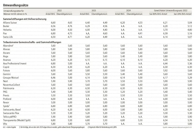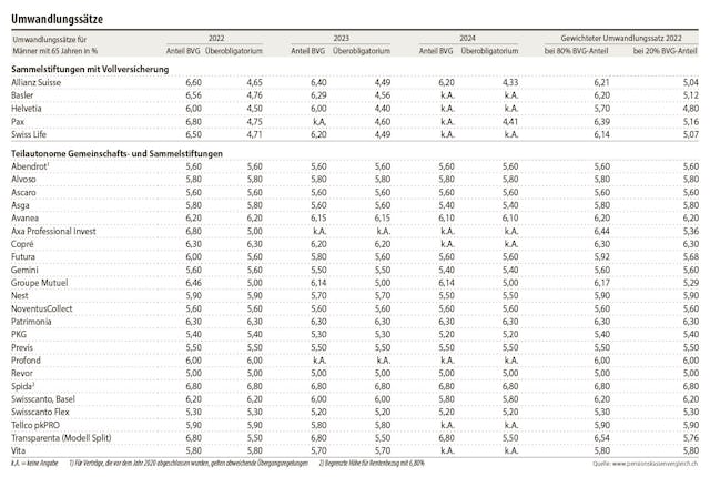 Während für das Obligatorium der gesetzliche Umwandlungssatz angewendet wird, kommt für überobligatorische Guthaben ein tieferer Satz zur Anwendung. Bei den teilautonomen Gemeinschafts- und Sammelstiftungen hat sich in den vergangenen Jahren ein Trend zu einem umhüllenden Umwandlungssatz durchgesetzt. Dabei wird das gesamte Altersguthaben unter Einhaltung der Mindestvorgaben mit demselben Umwandlungssatz berechnet. Solange bei jeder Pensionierung sichergestellt ist, dass die Gesamtrente höher ist als das Obligatorium allein zu 6,8% umgewandelt, ist diese Rechnung erlaubt. Die Pensionskassen sind verpflichtet, die Vergleichsrechnung bei jeder Pensionierung durchzuführen, und haben allfällige Differenzen zulasten der Reserven auszugleichen.