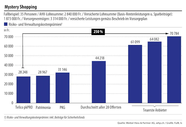 Die durchschnittlichen Risiko- und Verwaltungskosten der Offerten aller 28 Anbieter betragen 44 218 Fr. Die drei Angebote mit den höchsten Risikoprämien und Verwaltungskosten fallen mit 61 099 Fr. bzw. 64 082 und 70 784 Fr. wesentlich über dem Schnitt aus. Darunter sind auch die Offerten von Helvetia und Pax, die die kostengünstigsten Vollversicherungsangebote eingereicht haben