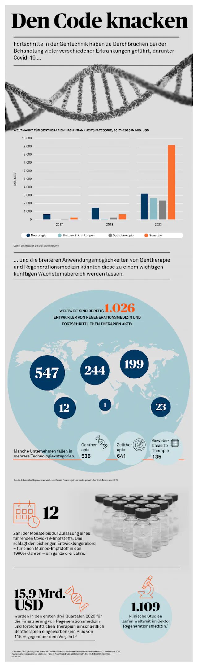 Das wird sich ändern. Gentherapien werden die «Mutter» aller zukünftigen Disruptionen im Zusammenhang mit dem Pharmasektor darstellen. Schon heute laufen mehr als 1000 klinische Studien in diesem Bereich. Mehrere der kürzlich entwickelten Impfstoffe gegen Covid-19 beruhen auf diesem Ansatz.
