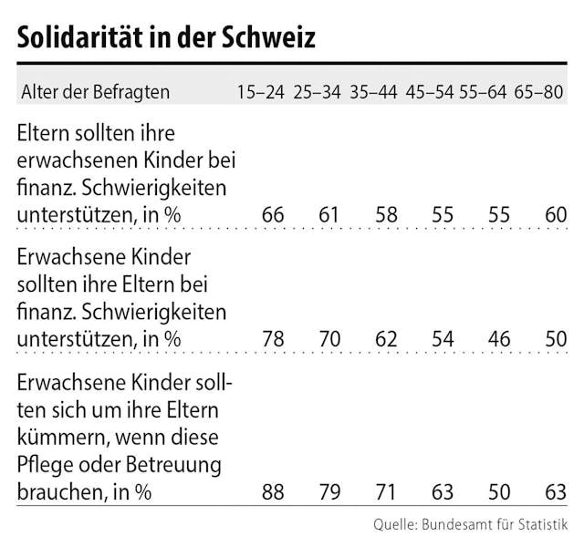 Obwohl das Zusammenleben von erwachsenen Kindern und alten Eltern in der Schweiz zur Ausnahme geworden ist, haben sich die familialen Generationenbeziehungen in den vergangenen Jahrzehnten eher verbessert als verschlechtert, oft nach dem Prinzip «Intimität auf Abstand» (gute Kontakte, weil jede Generation selbständig lebt). Der Ausbau der Altersvorsorge hat nicht zu einer Verringerung intergenerationeller Solidarität zwischen jungen und alten Familienmitgliedern beigetragen, sondern im Gegenteil familiale Generationensolidarität eher gestärkt.