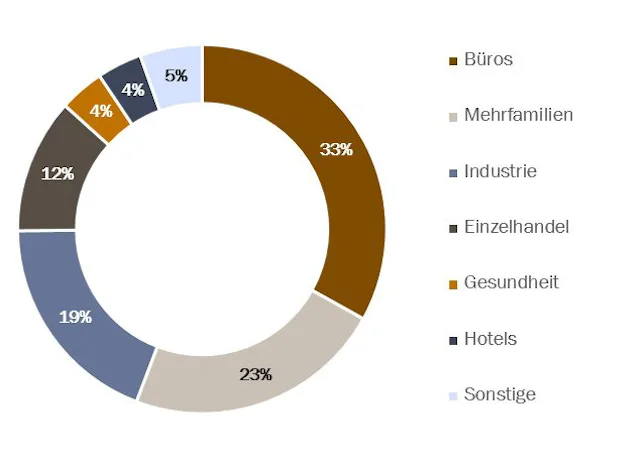 Investiertes Kapital (Immobilien) in Europa nach Sektoren, letzte 12 Monate: