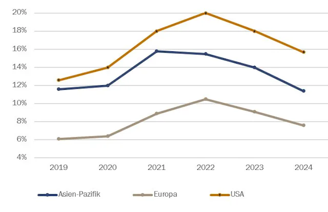 Potenzielle Veränderung des Büroleerstands, aufgeschlüsselt nach Regionen: