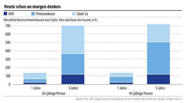 Anstelle einer Auszeit wählen hierzulande viele die Teilzeitarbeit, wenn sie eine Weiterbildung absolvieren oder ihre Kinder betreuen. Bei beiden Varianten ist der Effekt auf die Vorsorge fast gleich: