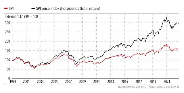 In den letzten dreiundzwanzig Jahren ist der Swiss Performance Index (SPI) inklusive Dividendenzahlungen um 194% gestiegen, ohne Dividenden aber nur um 57%. Die derzeit erwartete Dividendenrendite für den Schweizer Aktienmarkt (SPI) auf Sicht der nächsten zwölf Monate liegt bei 3,2%, was deutlich über dem 20jährigen Durchschnitt von 2,4% liegt (Stand per 21.9.2023).