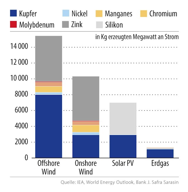Der Übergang erfordert weltweit erhebliche Investitionen in die Infrastruktur. Kupfer spielt eine zentrale Rolle bei Solarzellen, Windturbinen und Elektrofahrzeugen. Offshore-Windturbinen, die rund 8000 kg Kupfer pro Megawatt installierter Leistung benötigen, veranschaulichen diesen Bedarf. Elektrofahrzeuge, die mehr als 200 kg Metall benötigen, übertreffen damit herkömmliche Autos bei weitem. Bereits jetzt sind mehr als 26 Mio. Elektrofahrzeuge auf den Strassen unterwegs, die Hälfte in China. Der nötige Ausbau des Stromnetzes im Kontext der Elektrifizierung der Wirtschaft steigert den Bedarf an Kupfer zusätzlich. Schätzungen zufolge wird die Nachfrage bis 2035 signifikant steigen, allein um 10% für Elektrofahrzeuge. Investitionen in das Stromnetz benötigen ähnlich viel Kupfer und durch Wind- und Solarkraft steigt der Bedarf nochmals um die Hälfte. Gemäss konservativer Schätzungen also ein Gesamtanstieg um 25% bis 30%.