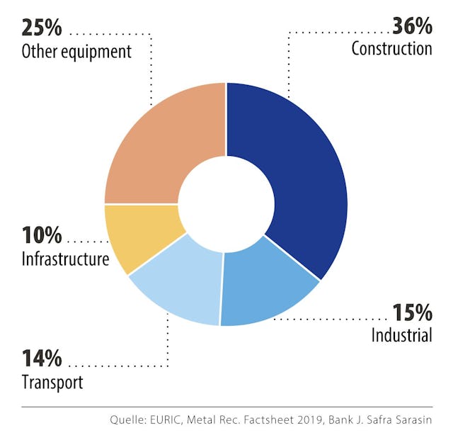 Aus Nachhaltigkeitssicht entsteht durch den erhöhten Kupferbedarf für die Energiewende und den gleichzeitigen Herausforderungen im Bergbau ein Dilemma. Ein kreislaufwirtschaftlicher Ansatz, der sich auf Effizienz, Wiederverwendung und Recycling konzentriert, kann den Druck auf die Primärversorgung etwas mindern. Allerdings variieren die heutigen Recyclingraten, wobei Regionen wie die EU bei der Sekundärproduktion führend sind. Aus der nachfolgenden Grafik geht hervor, dass der Grossteil des in der EU verwendeten Kupfers eine recht lange Lebensdauer aufweist, sodass sich eine Ausweitung der Recyclingbemühungen in Grenzen halten dürfte.