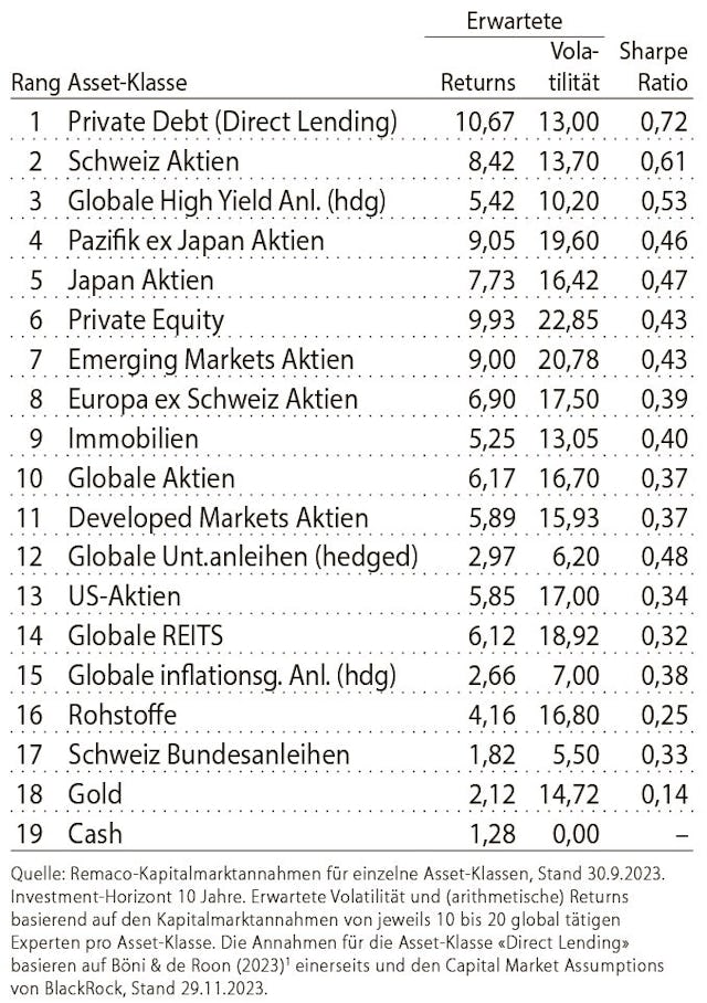 Die Performancebeurteilung von PMA sollte deshalb auf risikoadjustierter Basis erfolgen. Als erstes Risikomass kann die Volatilität einer Anlage beigezogen werden. Die Tabelle zeigt den erwarteten Return und die Volatilität für einen Anlagehorizont von zehn Jahren für verschiedene Asset-Klassen. Daraus ableiten lässt sich die Sharpe Ratio, oder das Entgelt pro Einheit des zu tragenden Investitionsriskos.