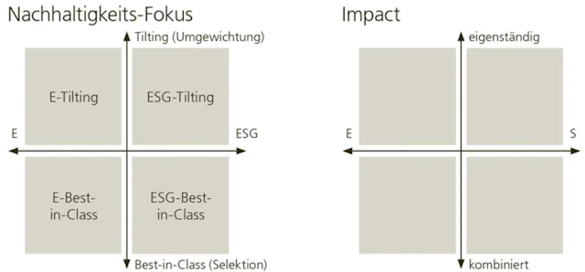 Nachhaltigkeitsmerkmale: Dieser Baustein fasst die wichtigsten Kriterien für einen Nachhaltigkeits-Fokus und Impact Strategie zusammen. Es sind dies die Mindestvoraussetzungen, die zur Vermeidung von materiellen Schäden beitragen. Ausserdem Nachhaltigkeits-Zielkriterien, um beabsichtige und beobachtbare Indikatoren zu berücksichtigen, sowie Impact-Ziele, um für Impact Strategien die zusätzliche, absichtliche, messbare und positive Wirkung auf die Umwelt und Gesellschaft festzulegen.