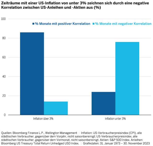 Wenn sich die Inflation weiter verlangsamt oder zumindest stagniert, ist nach den Analysen mit einer grösseren Abweichung zwischen der Wertentwicklung von Aktien und Anleihen zu rechnen. Die Untersuchungen zu US-Inflation, -Aktien und -Anleihen über den Zeitraum von 50 Jahren zwischen 1973 und 2023 zeigen auch, dass die negative Korrelation zwischen Anleihen und Aktien stärker ist, wenn die Inflation unter 3 % fällt (siehe Abbildung 1).