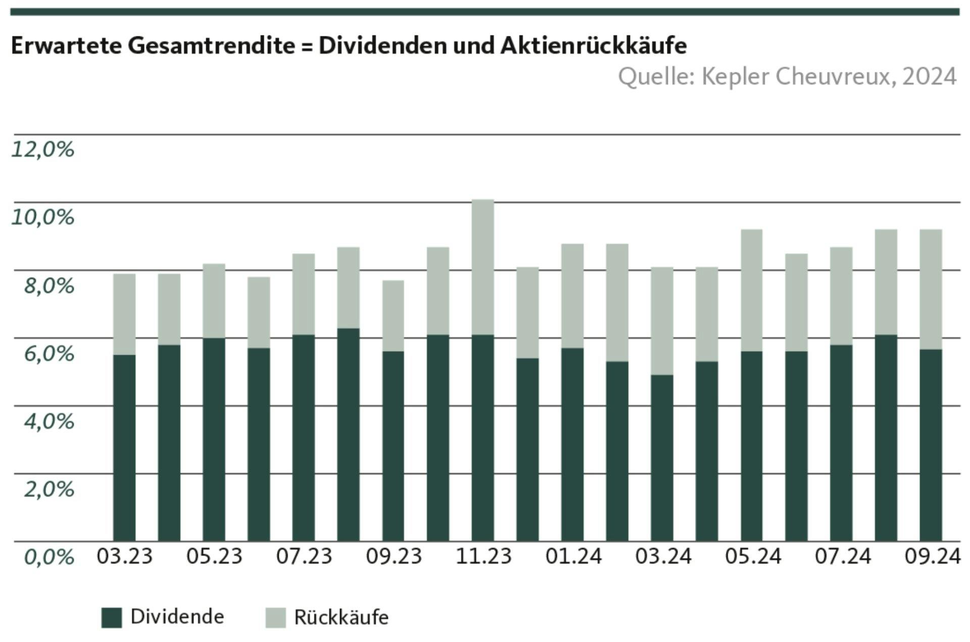 Im September dieses Jahres lag die erwartete jährliche Gesamtrendite der Basisstrategie von Kepler Cheuvreux bei 9,2 Prozent (siehe Grafik). Ein prominentes Beispiel im Aktienkorb ist der Pharmakonzern Novartis, dessen Dividendenrendite bei 3,3 Prozent liegt. Zudem hat Novartis im März 2023 ein dreijähriges Aktienrückkaufprogramm über 253 Millionen Aktien gestartet, was einer jährlichen Rückkaufrendite von 4,2 Prozent entspricht. Insgesamt profitieren die Aktionärinnen und Aktionäre von Novartis so von einer attraktiven Gesamtrendite von 7,5 Prozent. Weitere Qualitätstitel mit ähnlichen Gesamtrenditen im Korb sind Carrefour, Zurich und Accor.